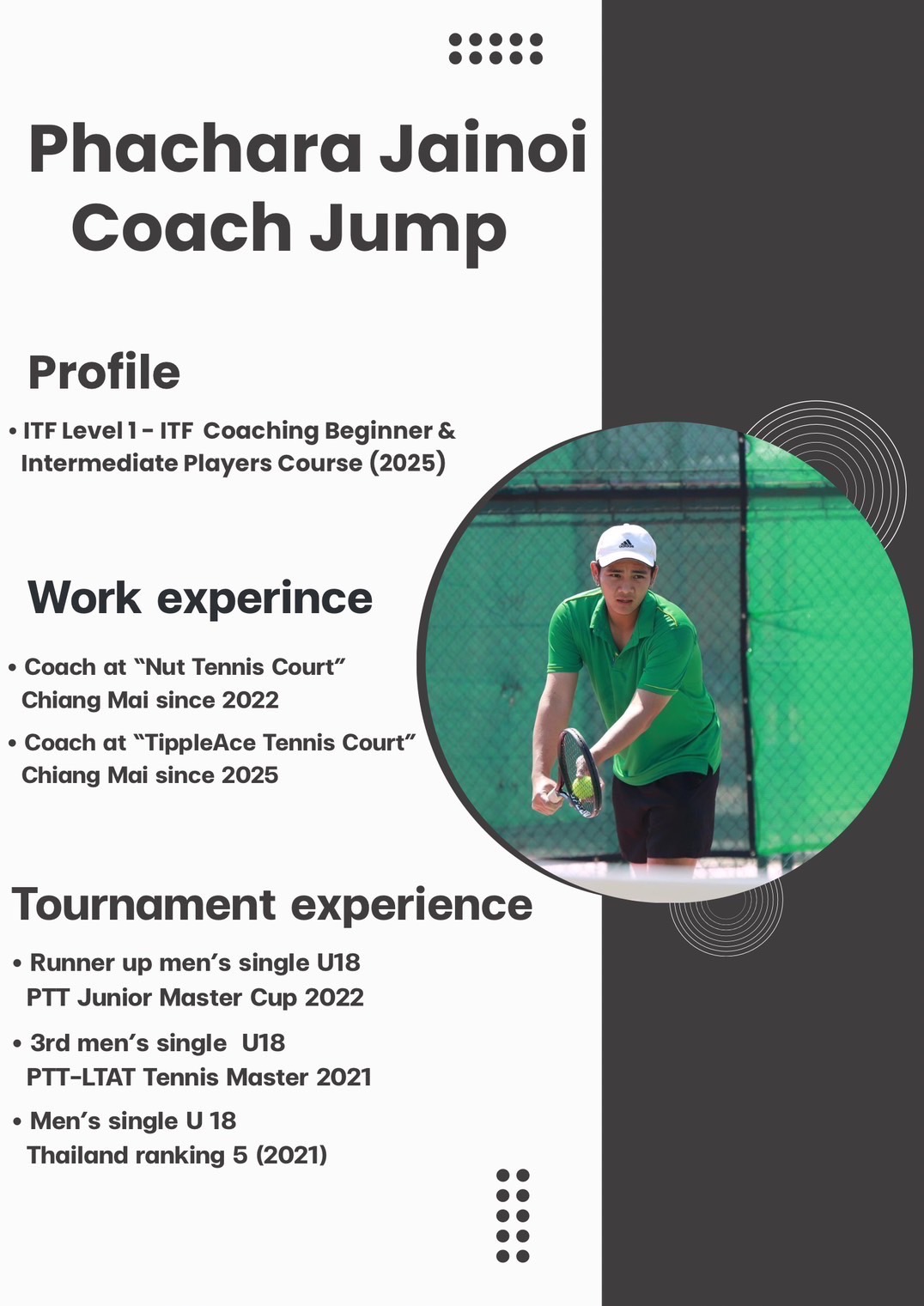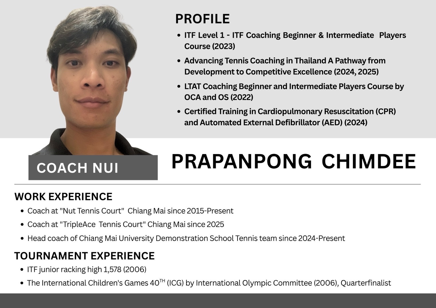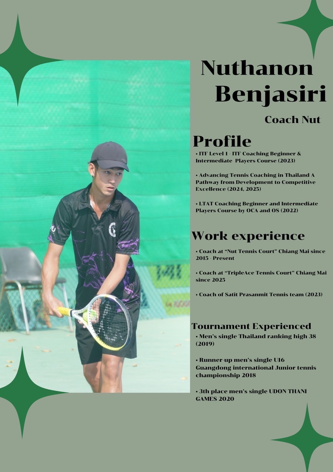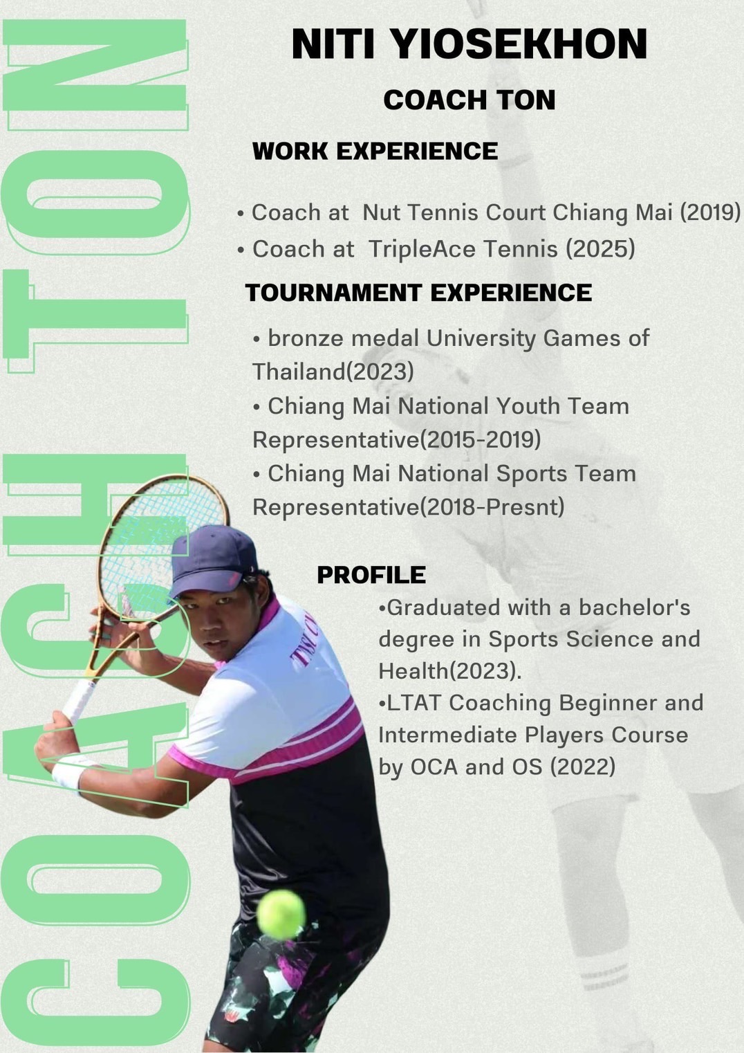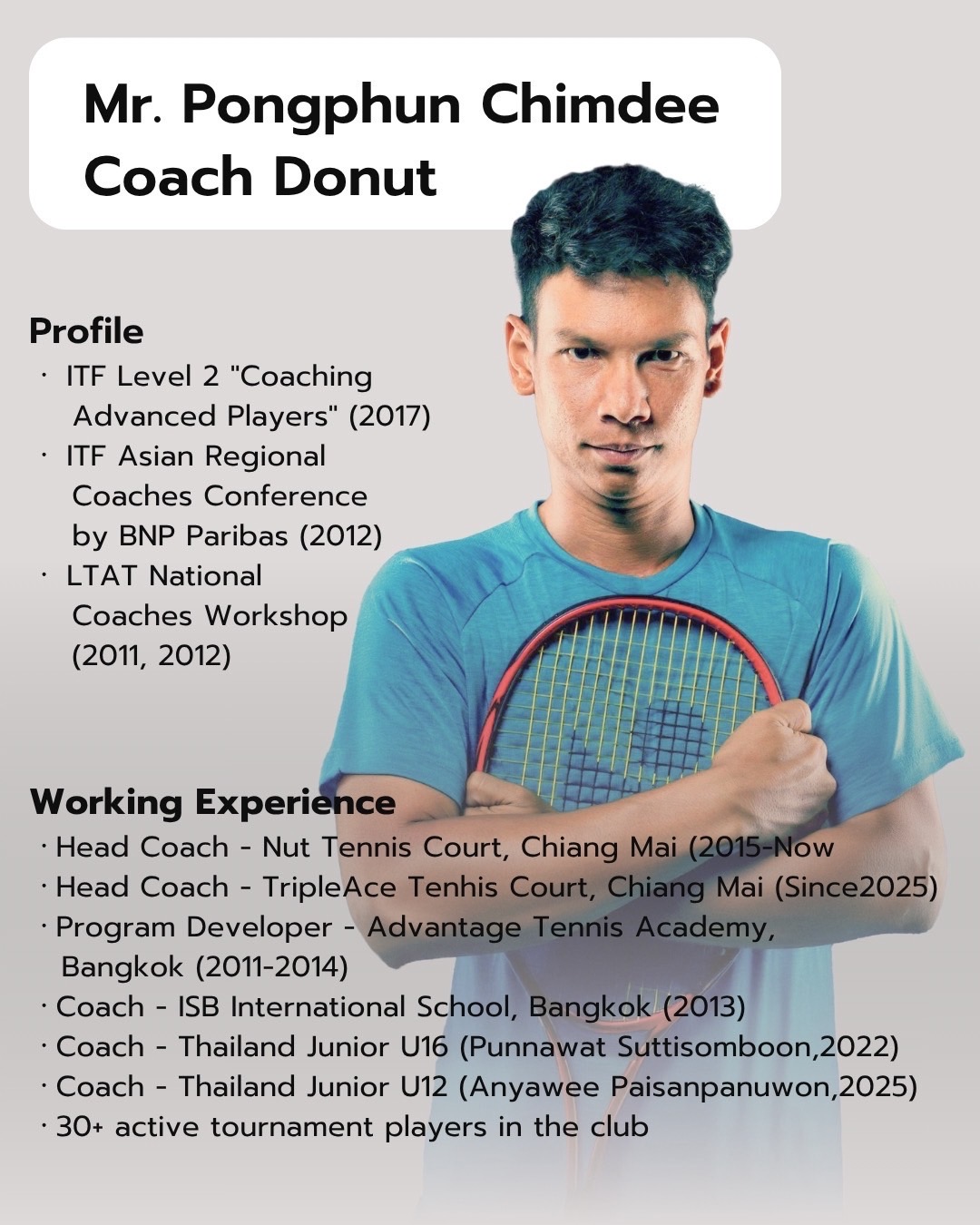 Nut Tennis Academy, the exclusive coaching partner of the TripleAce Club, is the most prestigious tennis academy in Chiang Mai. In recent years, we have nurtured a large number of high-quality junior players. Our coaching team employs the internationally recognized ITF training system. Most of our coaches hold ITF certificates, and Head Coach Donut has attained the ITF Level 3 certification, which is an excellent achievement even on the international stage. We offer high-quality private and group lessons.